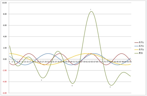 好了,现在我们将A+B+C,看看三种波叠在一起。会产生什么样的效果。我们有下图: