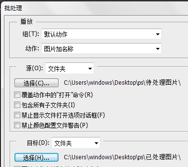 5.进行批处理。依次点击[文件] > [自动] > [批处理],弹出批处理窗口,动作选择“图片加名称”;源文件夹选择“待处理图片”,目标文件夹选择“已处理图片”,其他选项默认,确认即可。