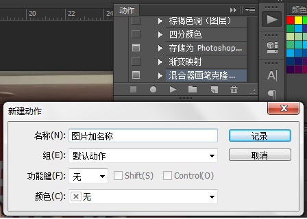 4.1点击动作按钮,新建一个名为“图片加名称”的动作,其他选项默认,点记录按钮开始记录。