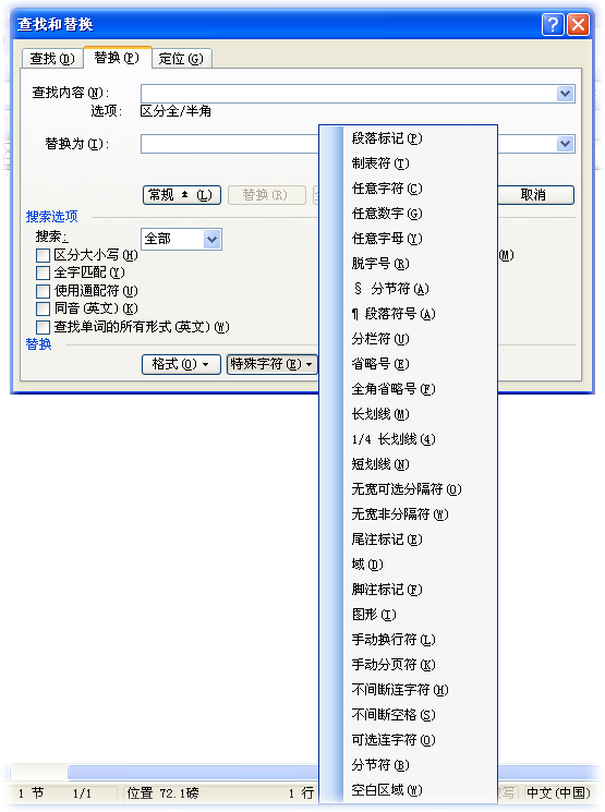 上面是Word 2003的高级替换打开后的界面,你可以通过单击编辑菜单,选择替换,单击高级按钮,然后单击特殊字符,单击你需要查找的特殊字符,就可以开始你的批量替换工作了。"