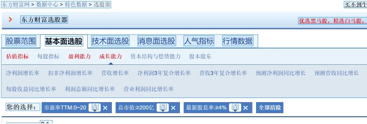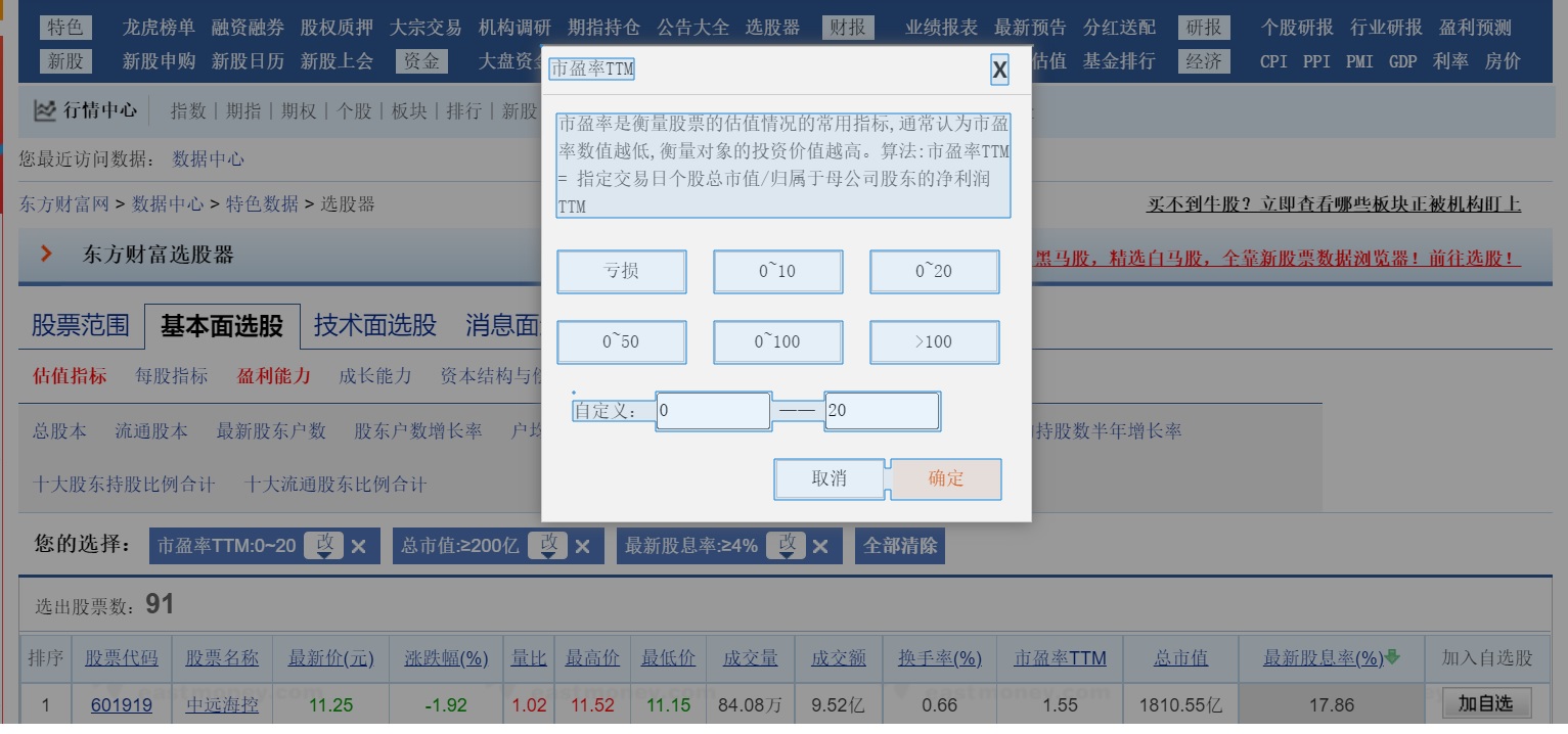 3.点开后,可以对具体的数值进行调整,也可以增加筛选条件,或者减少筛选条件,这些都是基本面选股的内容。