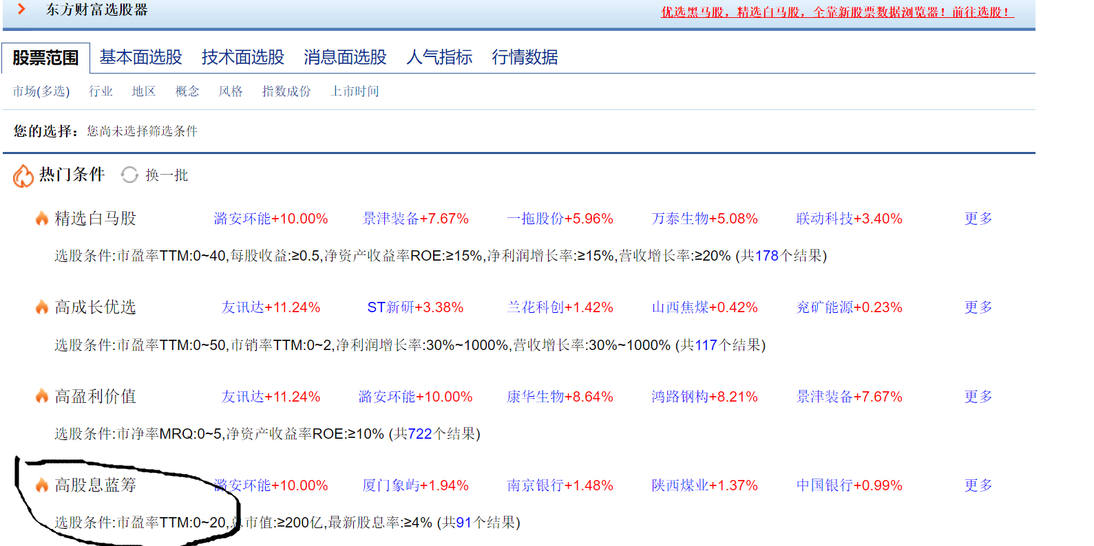 2.单击页面上高股息蓝筹,即可得到所需的股票列表。如果对条件不满意,可以在页面上进行调整。