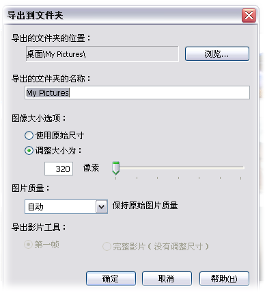 单击选定你需要成批修改的照片的文件夹,然后选择文件菜单,选择将图片导出到文件夹,弹出下面的对话框,你可以设置你需要的象素,单击确定,选定文件夹中的所有图片,都被按照要求修改,存入新的文件夹。