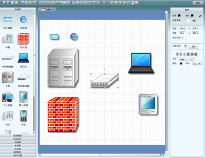 其网络图模板有:电子邮箱,浏览器,传真机,防火墙,网络集线器,笔记本,主机,集线器,个人电脑,掌上电脑,电话,手机,打印机,路由器,服务其,交换机,用户,无线配置器等。很是实用,许多Visio中都没有的。其基本图形有矩形,圆,正方形,五边形,六边形,八边形,直角三角形,五角星,圆角矩形,十字形,右箭头,左右箭头,圆主体等形状。