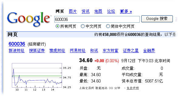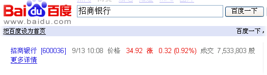 现在百度或者Google在你输入股票的代码或者拼音简称,如招商银行,你输入招商银行,或者股票代码600036,便可以快速找到当前股票的实时行情。两个搜索引擎相比较而言,Google的有30分钟的延迟,也就是说,你看到的数据是30分钟前的。Baidu则为实时的数据,没有延迟。但Google同时提供几个财经网站的与该股票相关的链接,包括新浪财经, 搜狐证券, 雅虎财经,网易财经,和讯,东方财富,证券之星,金融界 。Baidu只是提供和讯网的导航。不过说句良心话,Google是最先推出这个功能的。下面是两大搜索引擎提供的股票搜索结果对比图: