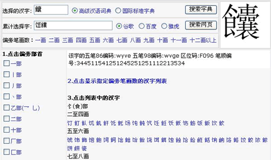 2. 单击要查找的汉字的偏旁部首,将会列出该偏旁的所有汉字。在显示的汉字列表中单击汉字,相应的汉字将会填入\"选择的汉字\"输入框,单击搜索,就可以根据需要进行汉字的读音,释义典故词组等的搜索。同时该汉字的汉字编码:五笔86编码,五笔98编码,区位码,笔顺编号将会同时显示。注意,如果只是单击偏旁前的检查框,需要单击显示汉字列表,显示汉字。注意:如果单击检查框,需要再单击一次显示汉字列表链接显示汉字。