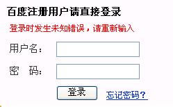 在百度的贴吧中看了一下,原来是百度在进行系统维护,想想既然是系统维护,为何不再页面上提示,而提示一个不三不四不伦不类的信息,误导用户。试验了一下注册新用户,和忘记密码功能,均无法正常使用。只有等百度的系统维护正常以后再登录了。希望百度能够改进系统错误时的信息提示,最好具体化!