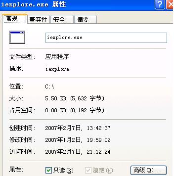 右键单击桌面上的IE图标,选择属性,在快捷方式中发现目标和起始位置被修改,目标中被修改为垃圾网站www.aimimi.com.起始位置被修改为%HOMEDRIVE%%HOMEPATH%,即系统安装的根目录,即C盘下,在C盘下找,果然发现一个explore.exe的程序。