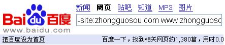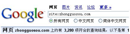 site:你的域名,如本站使用 site:www.zhongguosou.com,单击[url=http://www.zhongguosou.com/?searchkey=site:www.zhongguosou.com]site:www.zhongguosou.com[/url]看看。就是在搜索引擎中进行你的网站内部搜索。所有在搜索引擎中收录的网页将被列出。查看网页统计结果,就可以了解你的网站被搜索引擎收录的结果。下面是输入本站域名的统计结果:
