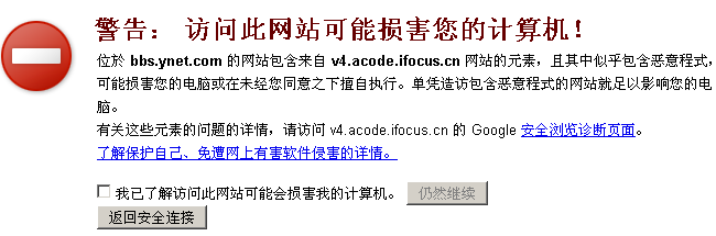 如果你访问了有恶意代码的网站,可要小心了,下面是Chrome提供的警告信息窗口: