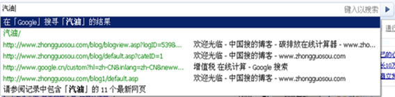 如果你在安装的时候选择的是Google搜索引擎,那么将采用Google为你进行搜索,在地址栏的下拉列表中有一行:在[Google]搜寻[...]的结果。在你输入关键字后,如果不立即进行搜索,Chrome的地址栏会根据预先的搜索结果为你显示搜索建议(1秒钟后),具体看下面输入汽油后的地址栏图: