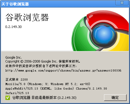 Chrome目前的升级速度比较快,它默认是自动升级的,自动检测是否有升级包,不需要人工参与,无论你是否在使用该浏览器,它都可以将浏览器升级为最新版本。如果你想查看升级信息或版本信息,单击浏览器右上角的扳手图标,选择谷歌浏览器,弹出如下关于谷歌浏览器的对话框,显示版本版权等信息。如果你的版本目前不是最新,将会有升级按钮显示,单击后可以升级,然后重新启动Chrome,就是最新版的了: