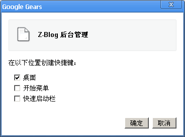 ,然后选择”创建应用程序快捷方式,弹出Google Gears(谷歌齿轮)设置框,见下面,你可以将该快捷方式保存在桌面、开始菜单或快速启动栏,然后单击确定即可: