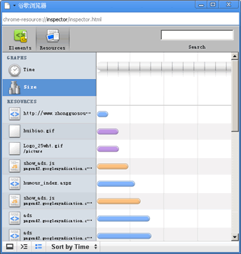 Size(尺寸:显示每个资源的大小;)。单击每个资源,在右侧立马显示该资源对应的内容,竟然可以很容易的查看Google ADs的源码文件。单击页面下面的Sort by Time 或Sort by Size,可以以大小或时间顺序排列。同加载速度想类似,在网页加载过程中,究竟什么资源比较大,尤其是当你的网页上放置广告代码和大量图片的时候,这个分析很有用。