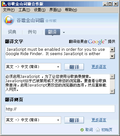 谷歌金山词霸合作版不错吧, 软件中不但没有任何广告,而且是免费的。最新版,目前支持整句即划即译。就如同屏幕取词一样,当你选定一段话后,自动翻译。谷歌金山词霸旧版中的Bug:单击帮助中的产品主页和产品论坛无反应,打开的是空白页。不知道新版中是否已纠正。