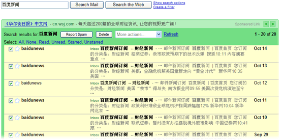 具体使用步骤如下,如我原来订阅的有百度新闻,关于财经方面的,邮箱中积累了很多。在Gmail顶部的搜索输入框中输入百度新闻,单击Search Mail按钮,列出所有主题为百度新闻的邮件,如下图: