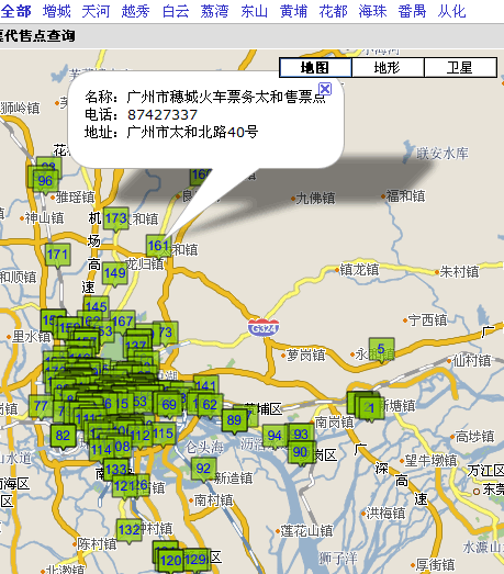 在线查询火车票代售点地理位置在线工具,加入了广东省如下城市的数据。在线工具的使用效果见下图。单击这里访问。Google电子地图使用技巧:双击可放大地图,按下鼠标左键不放,可左右拖动地图。地图左上角有标尺工具可以左右上下挪动地图,可以单击加减后放大缩小地图到合适尺寸。