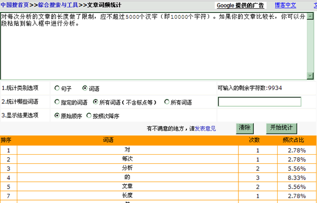 可以进行文章中句子出现频率(次数),词语出现次数(频率)进行在线统计的工具上线,可以统计你提交文章中句子或词语的出现频率,便于你进行文章结构分析,统计文章或新闻稿件中,各类句子出现了多少次数,各类词汇出现了多少次数,可用于老外们进行汉语的学习与研究等。
