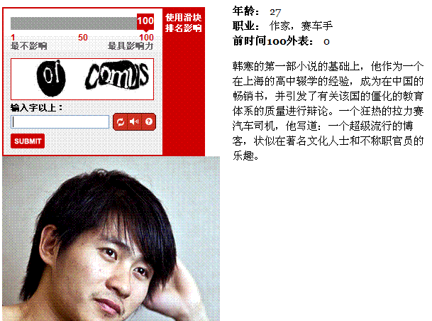 1. 红色数字条拉到100(红色数字条就在韩寒照片头顶,网页刚打开时数字条无法拖动,耐心等几十秒钟,甚至上分钟。这个一定要拖到100