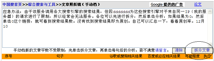 仔细阅读文章照妖镜自动档的说明,就可以明白:工作原理是自动将文章句子拆分后提交搜索引擎,按照返回结果进行分析。本站不会保存任何文章。