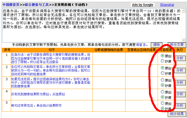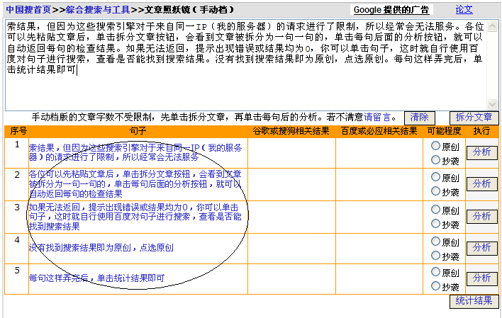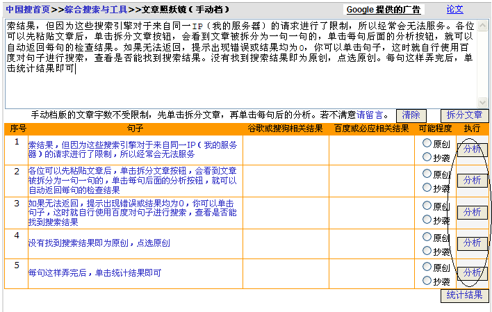 第二步:单击每句后面的分析按钮,就可以自动返回每句的检查结果,并相应的设置了可能程度。如果弹出对话框提示无法返回,或者所有句子的搜索结果均为0(注意:如果文章100%原创也如此),需要进行第三步。如果均能够正常返回,并相应的设置了可能程度。就不需要进行第三步,单击统计结果按钮即完成检测。