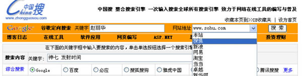 如你要在搜狐网站的网页中搜索赵丽华,在页面顶端的关键字中输入赵丽华,然后输入搜狐的网站地址:www.souhu.com,或者在下拉列表中选择搜狐,单击搜索即可。看下图: