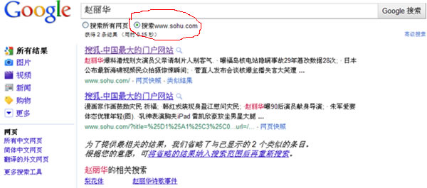 搜索后,你将会看到你的搜索结果是限定在搜狐网内的(注意下图的红圈),是定向的。