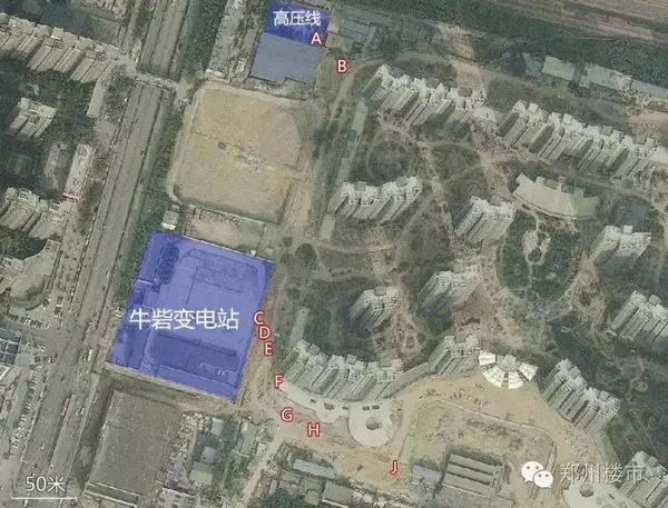 其中南边大的区域为牛砦变电站,四周没有高压线,而北边约200米有高压线,该线从地下引出向北输送,应该是牛砦变电站配套传输线。