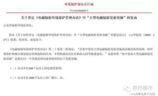 而第一条中出现的国家《电磁辐射保护管理办法》在“集中使用大型电磁辐射发射设施或高频设备的周围,按环境保护和城市规划划定的规划限制区内,不得修建居民住房和幼儿园等敏感建筑”,这句话环保部已经发公文声明,声明如下: