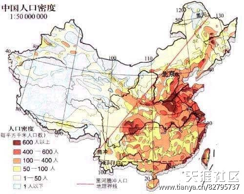 中国多数土地是不宜居的!这是一个常识。这就是著名的胡焕庸线,具体可以百度,简单来说就是“瑷珲-腾冲”45度角的线,自古以来,“东南方36%的国土居住着96%的国民”。线的东南方以平原、水网、丘陵、喀斯特和丹霞地貌为主要地理结构,自古以农耕为经济基础;线西北方人口密度极低,是草原、沙漠和雪域高原的世界,自古游牧民族的天下。