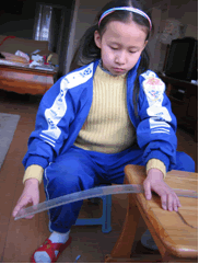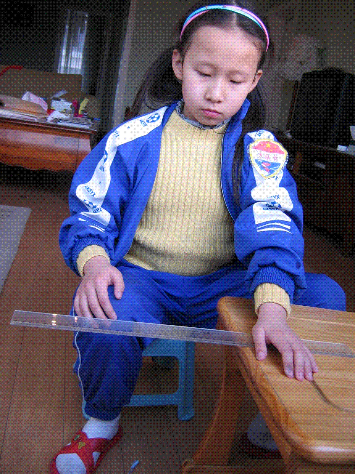 我把一根五十厘米长的尺子放到已清理干净的茶几上,将尺子的三分之二悬在空中,然后用手压紧在茶几上的三分之一的尺子,不要让它移动。然后用另一只手轻轻拨动尺子,就会看见尺子振动起来,你能感受到一阵风,并且能听见尺子带动空气发出的“呼呼”声。