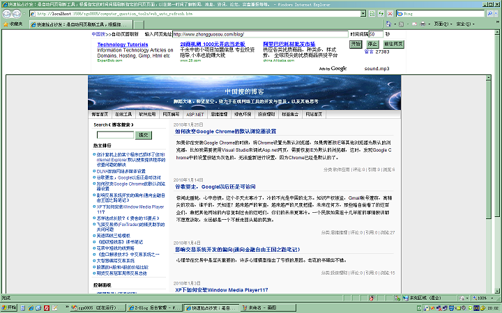 使用指南:粘贴或者输入你需要关注的网页地址,然后单击开始按钮,就可以进行实时监测了。默认刷新时间是50秒,比较合适,不能设置的太短(不可小于10秒)。在网页上的内容发生变化时,将会有语音提醒和文字提醒您。同时,刷新的时间间隔自动增加10秒。在输入博客等地址时,注意输入首页的地址,输入单个文章的地址是无法检测到的。对于首页上列有评论更新列表的博客,可能会发生误报,即有新评论发表也会报警。比如韩寒博客首页地址为:http://blog.sina.com.cn/u/1191258123