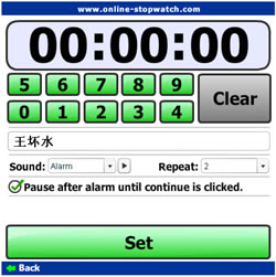 经典数字倒计时器:单击下面的数字,设置倒计时的时分秒,如果你要从12:34:50开始倒计时,顺序单击1、2、3、4、5、0几个数字键,然后单击Set(设置)键。要从10分钟开始倒计时,顺序单击1、0、0、0即可。依次类推。(全屏显示)要清除设置单击Clear(清除)键。单击Set键后,设置成功,单击Start(开始)键开始倒计时。在秒数字下面显示的是毫秒。到时后,有声音提醒。